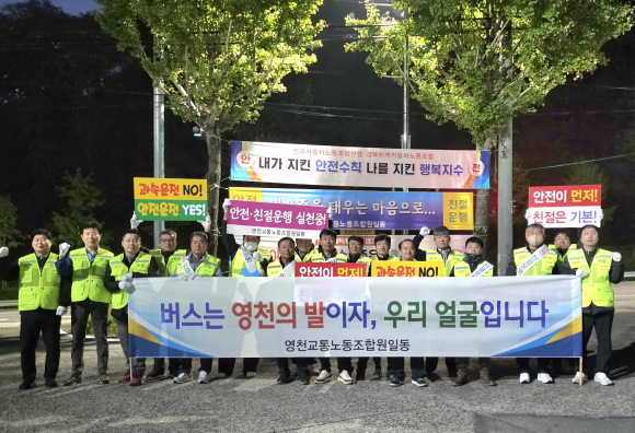 영천교통 노동조합은 지난 5일 회사 차고지내에서 조합 간부와 직원들이 참여한 가운데 ‘안전·친절 운행 캠페인’을 실시했다.영천교통 소속 120여명의 버스 운전기사들을 대상으로 열린 이번 캠페인은 안전 운행의 중요성과 시민 친절 서비스의 실천을 강조하기 위해 마련됐다.사공영신 영천교통노동조합장은 “버스는 영천의 발이자 우리 얼굴” 이라며 “운전기사 한 사람 한 사람의 안전의식과 친절한 태도가 곧 회사의 신뢰이고, 영천 시민의 자부심이 될 것”이라고 말했다.영천교통 노동조합은 “앞으로도 정기적인 안전·친절 캠페인을 통해 시민 만족도를 높이고, 노사가 함께 만드는 안전한 교통문화 조성에 앞장 서겠다”고 말했다.