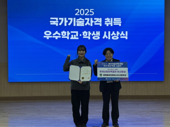 경북바이오마이스터고등학교는 20일 고용노동부와 한국산업인력공단이 주최한 ‘2025년 국가기술자격 취득 우수학교 시상식’에서 우수상(한국산업인력공단 이사장상)을 수상했다.국가기술자격 취득 우수학교 시상식은 국가기술자격 취득을 통해 우수한 성과를 보인 학교와 소속 학생을 격려하고 기술인력에 대한 우대 문화 정착에 기여하고자 개최했다.전국에서 최우수학교 17개교, 우수학교 17개교로 총 34개교가 시상했으며, 바이오 분야에서 유일하게 경북바이오마이스터고등학교가 우수상을 수상했다.경북바이오마이스터고등학교는 2024년에 첫 과정평가형 자격 바이오화학제품제조산업기사에 응시하여 92%합격률을 달성하였으며, 그 외에도 화학분석기능사, 환경기능사를 주요 자격 종목으로 취급하고 있다.정미정 교장은“이번 국가기술자격 취득 우수학교 선정은 학생들의 전문성 강화와 실무 중심 교육의 성과가 입증된 결과이며, 앞으로도 바이오 산업 수요에 부응하는 미래 기술인력을 양성시키기 위해 학교 차원의 교육·연구 지원을 더욱 확대하겠다”고 말했다.