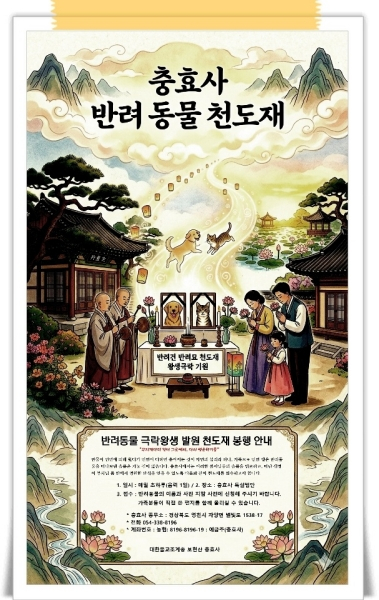 반려동물을 가족처럼 여기는 인식이 확산되면서, 떠난 반려동물을 기리는 ‘천도제’가 새로운 추모 문화로 자리 잡고 있다.최근 전국 사찰에서는 반려견과 고양이를 위한 천도재가 잇따라 열리며 반려인들의 발길이 이어지고 있다. 천도재는 불교에서 망자의 극락왕생을 기원하는 의식으로, 이를 반려동물에게까지 확장한 것이다.천도재가 진행되는 법당에는 위패 대신 반려동물의 사진이 놓이고, 생전에 좋아하던 사료나 간식, 장난감 등이 함께 올려진다. 보호자들은 이름을 부르며 마지막 인사를 건네거나, 눈물을 흘리며 기도를 올리는 모습도 쉽게 볼 수 있다.불교계는 이러한 흐름에 대해 자연스러운 변화라는 입장이다. 불교에서는 모든 생명이 윤회를 거듭하는 존재로 보기 때문에 동물 역시 천도를 통해 더 나은 삶으로 나아가길 기원할 수 있다는 설명이다.특히 반려동물 인구 1000만 시대에 접어들면서 ‘펫로스 증후군’을 겪는 이들이 증가한 것도 배경으로 꼽힌다. 가족과 같은 존재를 잃은 상실감을 해소하기 위한 심리적 치유 과정으로 천도제가 주목받고 있다는 분석이다.영천시 자양면 위치한 충효사도 매월 초하루(음력1일) 반려동물 극락왕생 발원천도재를 봉행하고 있다.충효사는 반려동물뿐 아니라 유기동물, 실험동물 등을 위한 합동 천도재도 함께 진행하며 생명 존중의 의미를 확장하고 있다.이처럼 반려동물과의 이별을 기리는 방식이 다양해지면서, 천도제는 단순한 종교 의식을 넘어 현대 사회의 새로운 추모 문화로 자리매김하고 있다.